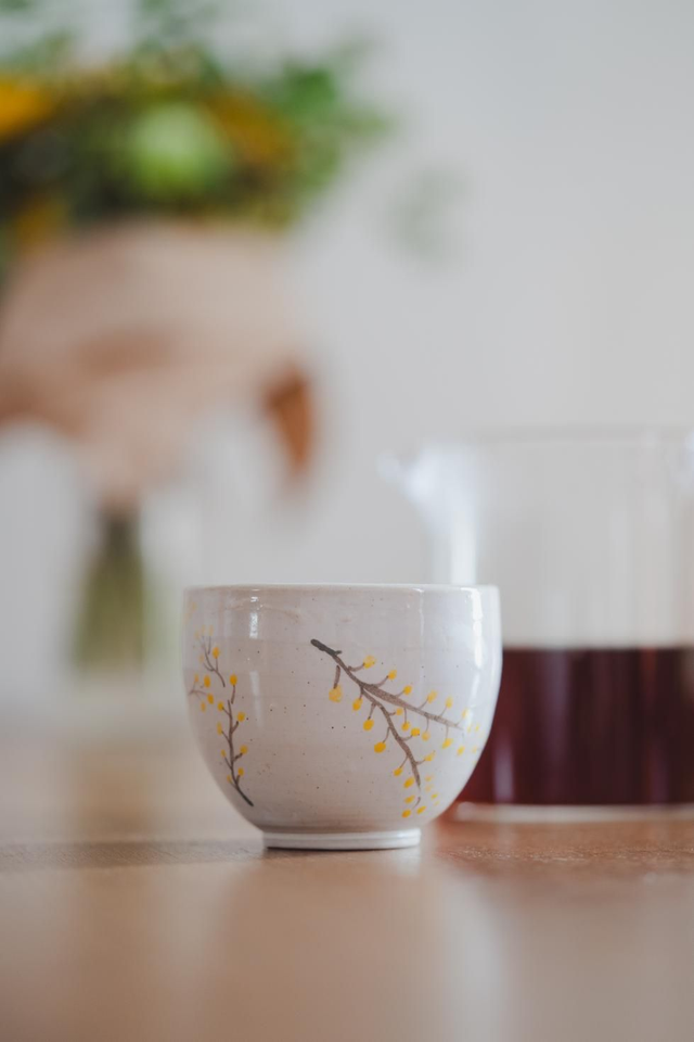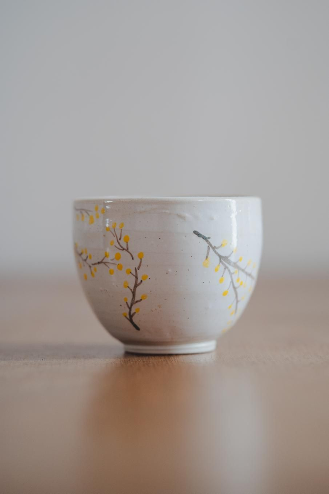 Duo de tasses au décor Mimosa. Taille M, celle idéale pour le cappuccino, le café allongé, le fromage blanc ou la compote. Façonnées et peintes à la main, toutes les tasses sont légèrement différentes et uniques.