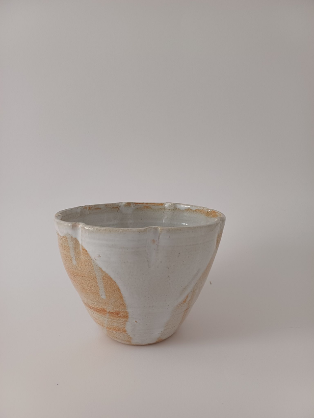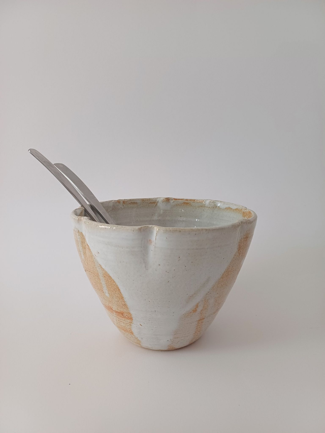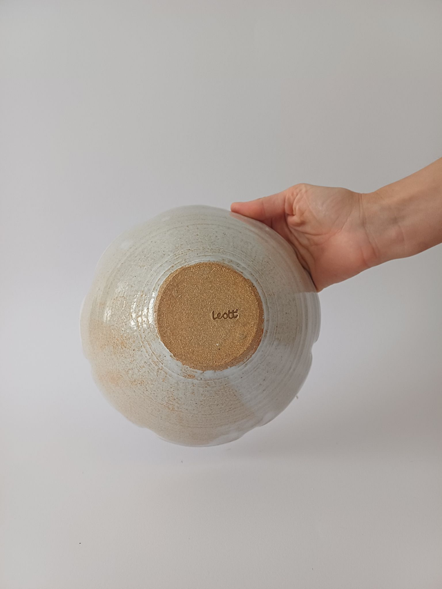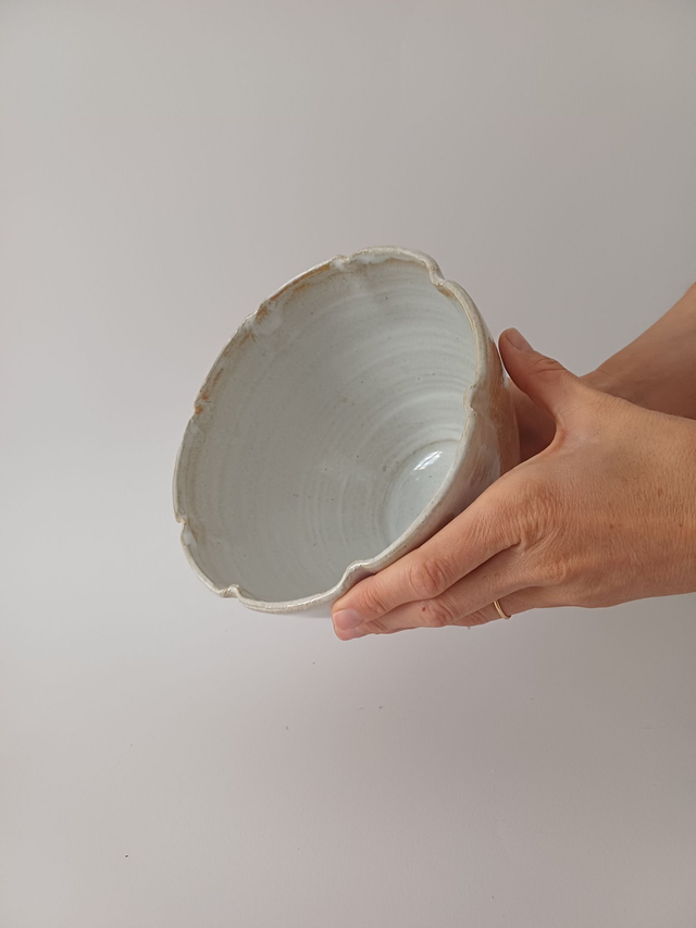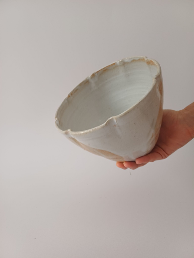 Ce saladier en grès roux allie tradition et délicatesse. Je l’ai façonné en terre rousse. Il est recouvert d’un émail blanc irrégulier, ce qui me rappelle les poteries traditionnelles de campagne. Les rebords pincés en forme de fleur lui ajoute de la finesse et un aspect intemporel. Vous pourrez le passer au lave-vaisselle mais il faudra lui éviter absolument les chocs thermiques.